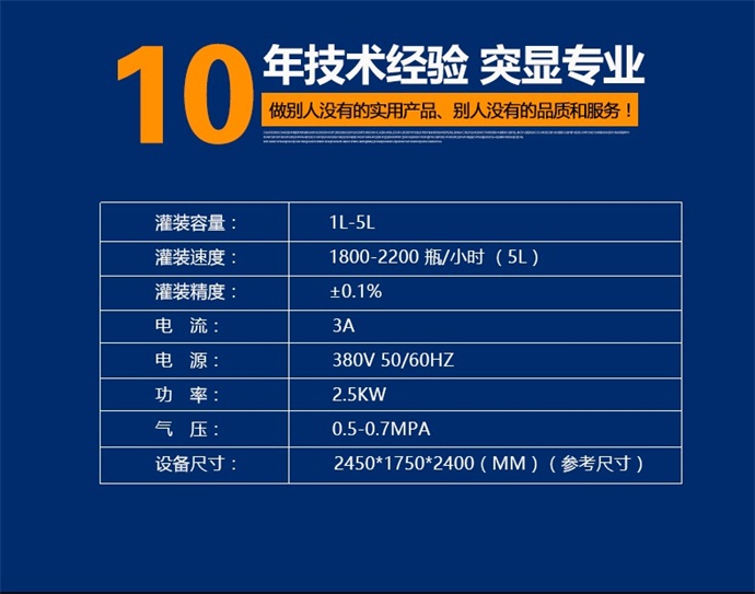 產(chǎn)品簡(jiǎn)介 該系列灌裝機(jī)采用流量計(jì)式計(jì)量灌裝原理,多項(xiàng)專利認(rèn)證,適用于各種規(guī)格(1-5升)的南瓜籽油、榛子油、牡丹籽油、芝麻油、山茶油、亞麻籽油、棉籽油、橄欖油、大豆油、玉米油、菜籽油等食用油灌裝。設(shè)備采用高精度的旋轉(zhuǎn)編碼器計(jì)量,保證了1%的灌裝精度,在保證灌裝精度的同時(shí),提高了20%-35%的灌裝速度,操作簡(jiǎn)單,維護(hù)方便,節(jié)約人工成本,生產(chǎn)效率更高。 產(chǎn)品數(shù)據(jù): 灌裝容量:1L-5L 灌裝速度:1800-2200瓶/小時(shí)(5L) 灌裝精度:0.1% 電流:3A 電源:380V 50/60HZ 功