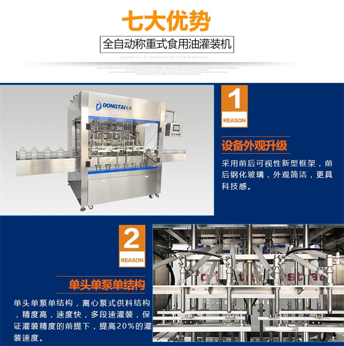 設(shè)備介紹 Part.1 全自動(dòng)稱重式 食用油灌裝機(jī) 產(chǎn)品簡(jiǎn)介: 機(jī)適用于對(duì)流體5 kg-30kg 的計(jì)重量灌裝。自動(dòng)完成計(jì)數(shù)進(jìn)瓶、計(jì)重量灌裝、輸送出瓶等一系列操作。 特別適用于水劑、食用油,潤(rùn)滑油的定量灌裝,是食品,醫(yī)藥,化妝品以及精細(xì)化工等行業(yè)的理想包裝機(jī)。 本機(jī)采用可編程控制器( PLC) 、高速工控組態(tài)軟件進(jìn)行實(shí)時(shí)監(jiān)控的控制,使用調(diào)節(jié)方便。整機(jī)按 GMP 標(biāo)準(zhǔn)要求制作,各管路連接采用快裝方式,拆卸清洗方便,與物料接觸部位