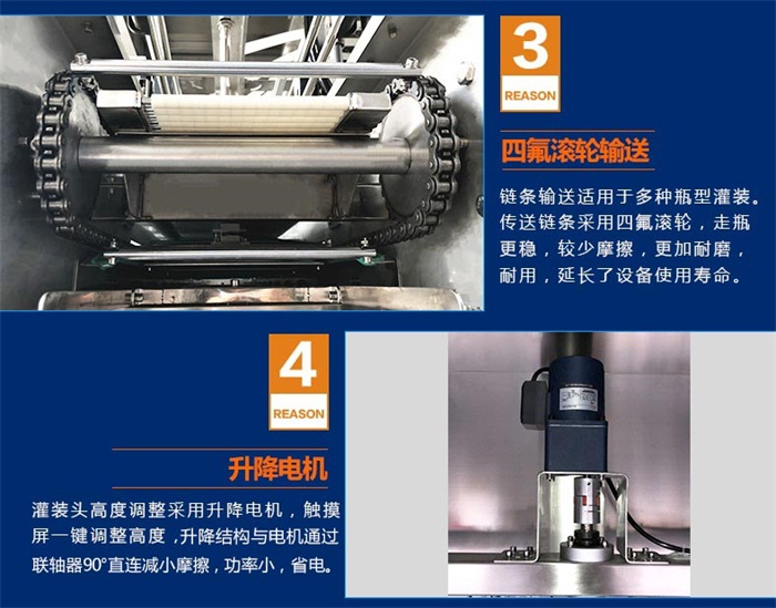 3、灌裝頭高度調(diào)整采用升降電機(jī),,觸摸屏一鍵調(diào)整高度,升降結(jié)構(gòu)與泵通過聯(lián)軸器90°直連減小摩擦,功率小,省電;