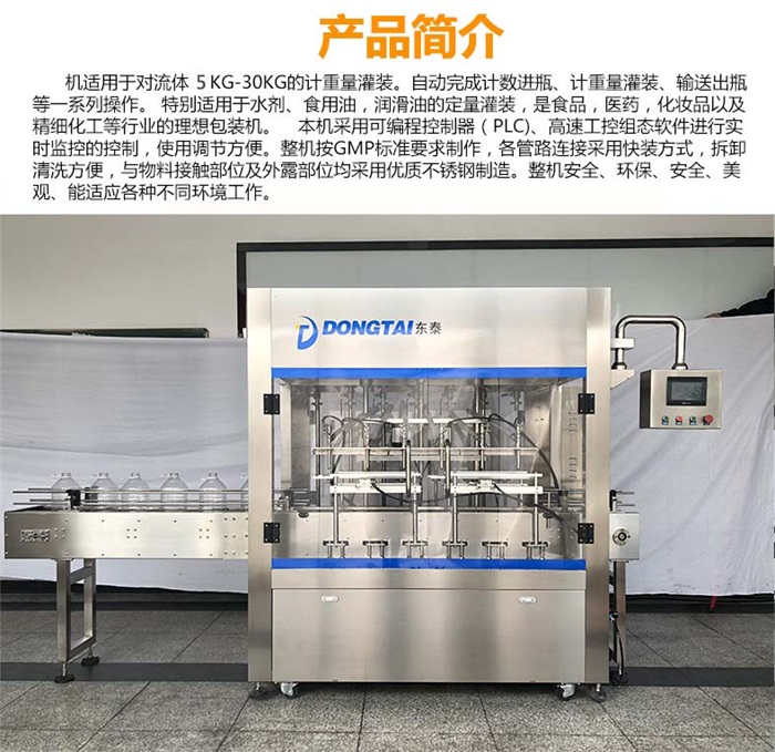 機(jī)適用于對(duì)流體5kg-30kg的計(jì)重量灌裝。自動(dòng)完成計(jì)數(shù)進(jìn)瓶、計(jì)重量灌裝、輸送出瓶等一系列操作。 特別適用于水劑、食用油,潤(rùn)滑油的定量灌裝,是食品,醫(yī)藥,化妝品以及精細(xì)化工等行業(yè)的理想包裝機(jī)。 本機(jī)采用可編程控制器(PLC)、高速工控組態(tài)軟件進(jìn)行實(shí)時(shí)監(jiān)控的控制,使用調(diào)節(jié)方便。整機(jī)按GMP標(biāo)準(zhǔn)要求制作,各管路連接采用快裝方式,拆卸清洗方便,與物料接觸部位及外露部位均采用優(yōu)質(zhì)不銹鋼制造。整機(jī)安全、環(huán)保、安全、美觀、能適應(yīng)各種不同環(huán)境工作。
