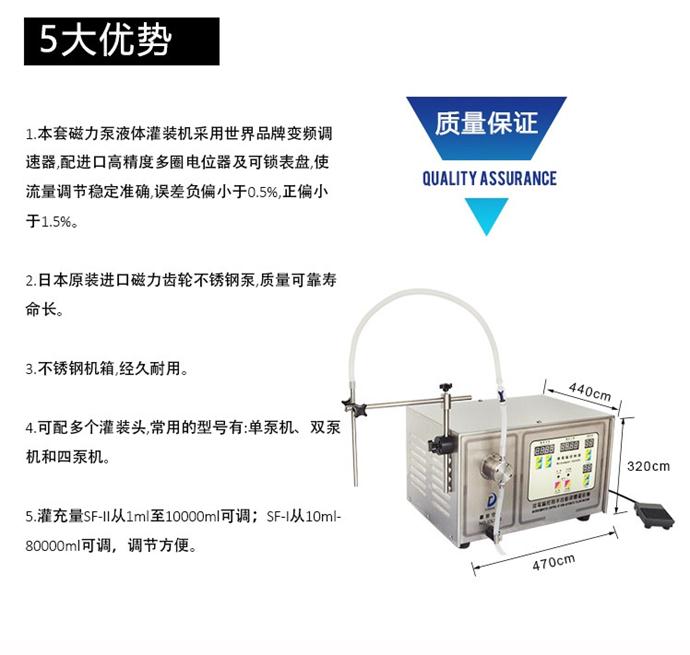 磁力泵式半自動(dòng)液體灌裝機(jī) 名稱(chēng)型號(hào): 磁力泵灌裝機(jī) SF-II型 主要用途 可灌充絕大類(lèi)型的液體,包括高粘稠度的液體。如:各種藥劑、化學(xué)品、油類(lèi)、化妝品、食品等無(wú)顆粒狀液體;灌裝精度高