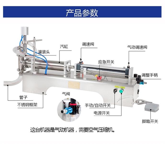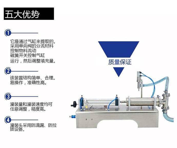 DY系列灌裝機為半自動活塞式灌裝機,通過氣缸帶動一個活塞來抽取和打出物料,用單項閥控制物料流向,用磁簧開關控制氣缸的行程,即可調節灌裝量。